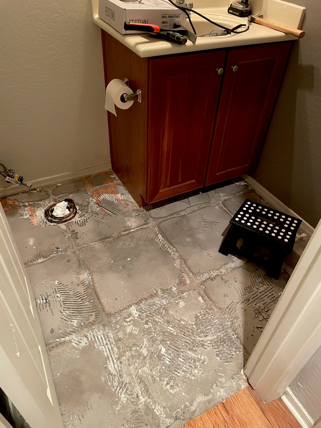 Details: Bathroom • Floor • Less than 25 sq ft • Concrete • Porcelain • Yes, I already have the tiles