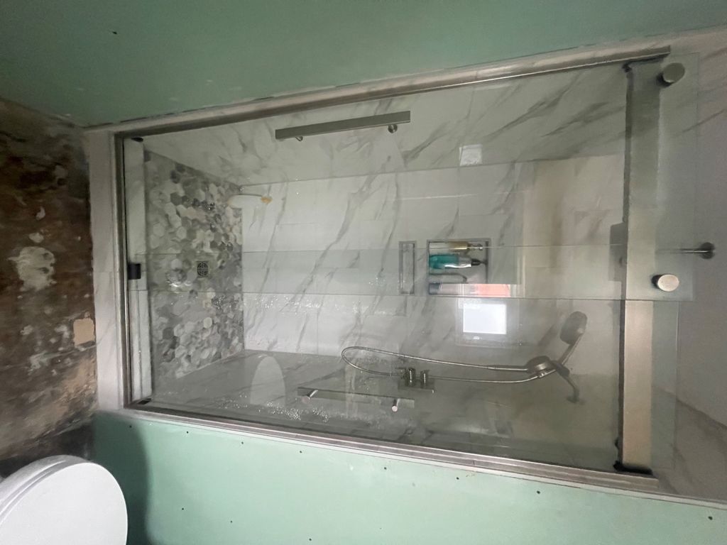 Details: Shower or tub door • 1 door • Sliding glass • Barn • Glass • No, but the door frame exists • Yes, I already purchased the door • Home
